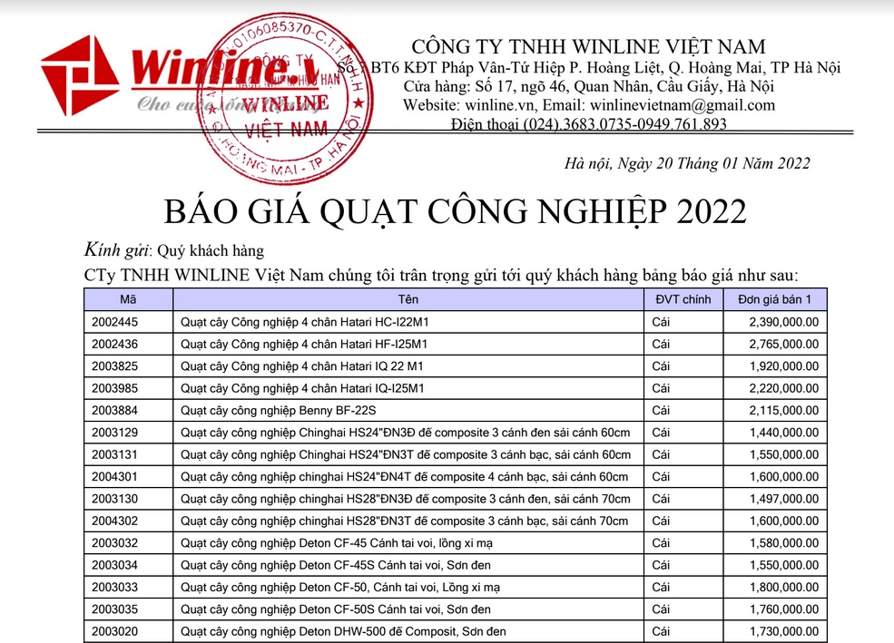 Công ty TNHH WINLINE Việt Nam chúng tôi trân trọng gửi tới quý khách hàng bảng báo giá Quạt công nghiệp mới nhất