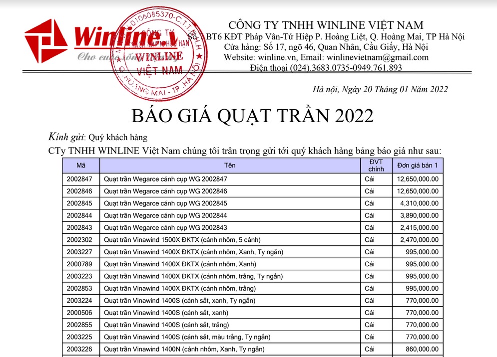 Cảm ơn quý khách hàng đã quan tâm đến sản phẩm và dịch vụ của Công ty TNHH WINLINE Việt Nam, chúng tôi trân trọng gửi tới quý khách hàng bảng báo giá Quạt trần mới nhất
