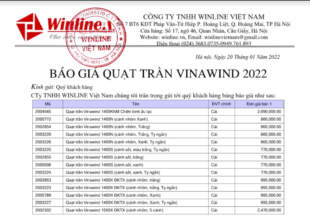 Cảm ơn quý khách hàng đã quan tâm đến sản phẩm và dịch vụ của iCông ty TNHH WINLINE Việt Nam, chúng tôi trân trọng gửi tới quý khách hàng bảng báo giá Quạt trần Vinawind mới nhất. Xin mời quý khách xem và tải báo giá tại đây: