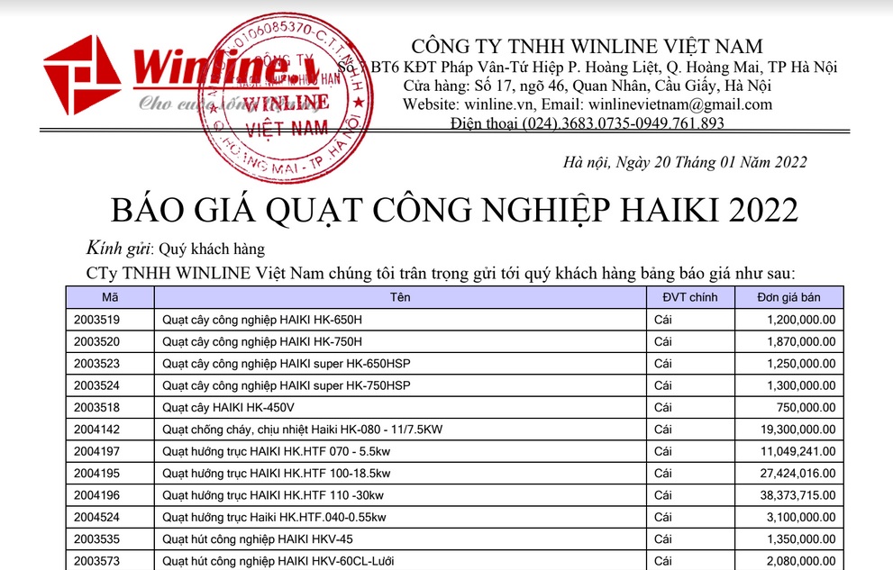 Công ty TNHH WINLINE Việt Nam chúng tôi trân trọng gửi tới quý khách hàng bảng báo giá Quạt công nghiệp HAIKI mới nhất