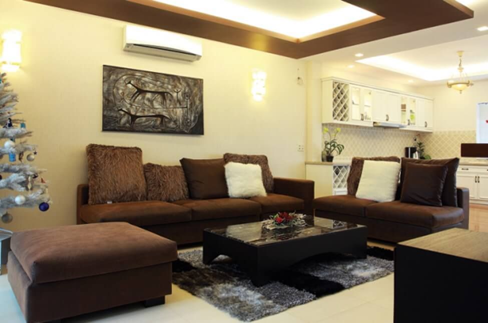 Màu nâu trầm được sử dụng trong nhiều căn hộ hiện đại ngày nay, bởi nó mang lại sự ấm cúng và dễ chịu cho căn phòng khách, không những thế nó màu nâu trầm khiến căn phòng hiện đại và tiện nghi hơn. Để tạo điểm nhấn, gia chủ có thể điểm thêm những bức tranh về hoa đào, hoa mai với màu nền tranh nhã phù hợp với tổng thể.