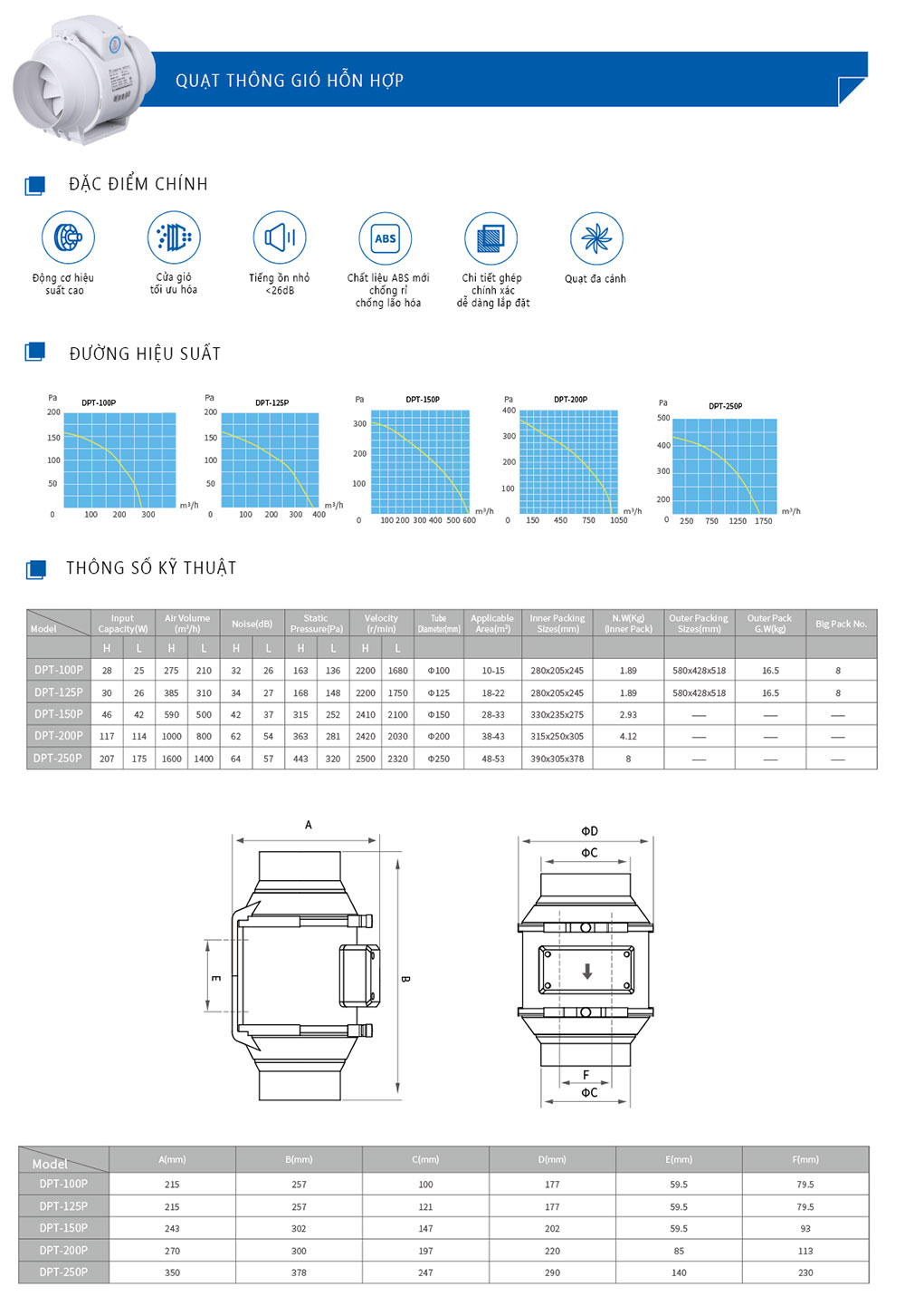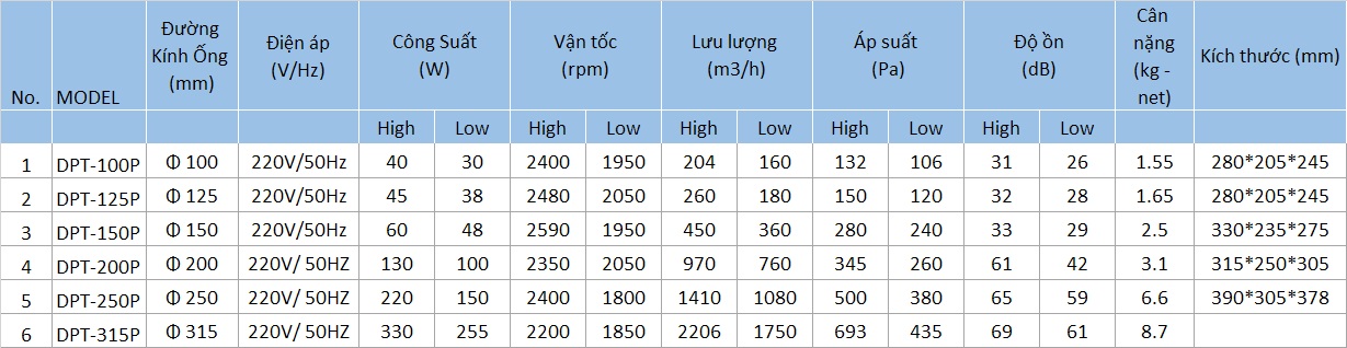 Quạt cấp khí tươi Nanyoo Mixed Flow DPT-315P, (80-100m2) có ưu điểm là áp suất cao, lưu lượng không khí lớn, Quạt có độ ồn tấp, dùng cho thông gió, hút khói, hút khí thải...
