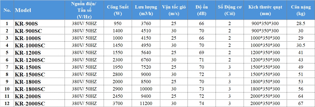 Bảng thông số kỹ thuật Quạt cắt gió Kyungjin KR-1000S chiều cao cửa dưới 8m
