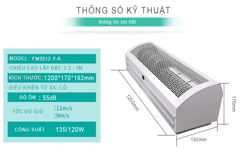 Quạt cắt gió Nedfon FM3012-Y-A có điều khiển từ xa, 2 tốc độ gió, chiều dài 1.2m, chiều cao lắp đặt 2.3 ~ 3m, diện tích khuyến nghị 20~40m2
