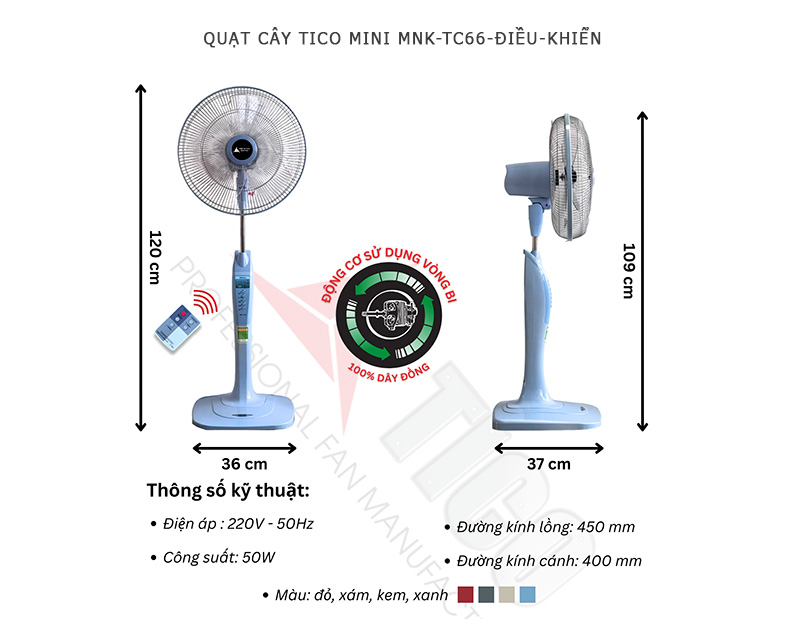 Quạt cây Tico mini MNK-TC66 là loại quạt cây nhỏ, có điều khiển từ xa, phù hợp không gian nhỏ gọn, màu sắc bắt mắt
