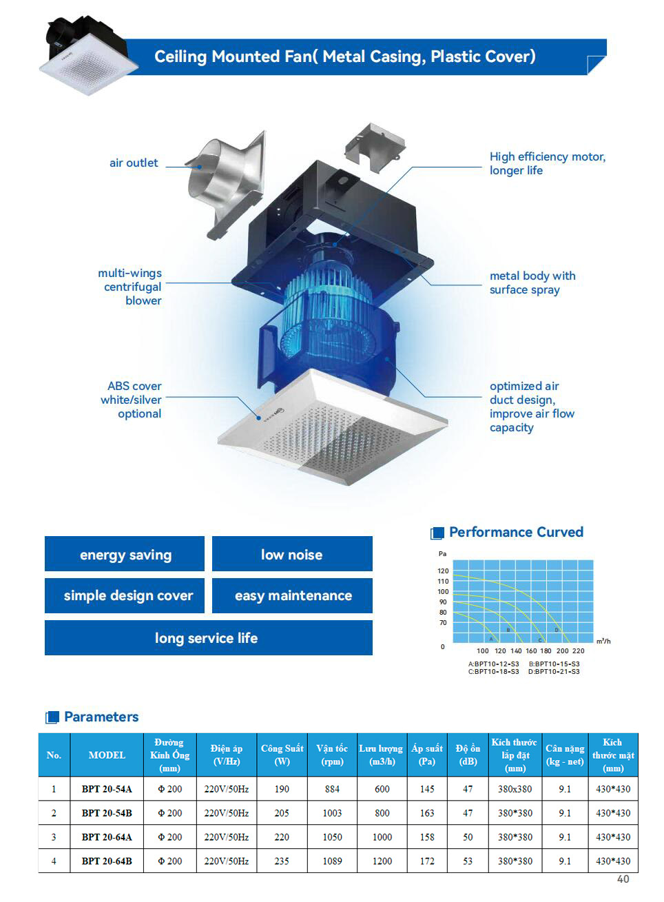 Quạt hút âm trần chống cháy Nanyoo BPT 20-54A Hoạt động êm, Độ ồn thấp, Lưu lượng gió: 600m3/h, Diện tích sử dụng khuyến nghị: (20-40m2), lỗ chờ 380x380mm