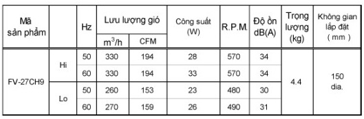 | Tên sản phẩm | Quạt hút âm trần Panasonic FV-27CH9 | |