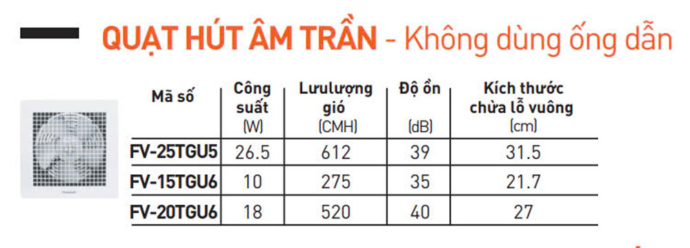 | Tên sản phẩm | Quạt hút âm trần Panasonic FV-20TGU6 |