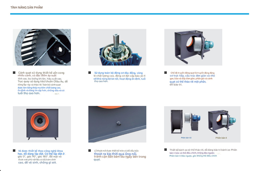 Công nghệ cánh quạt: Sử dụng cánh quạt ly tâm đa cánh cong về phía trước, giúp tạo ra áp suất tĩnh cao, tăng đáng kể lưu lượng khí và giảm thiểu tiếng ồn.