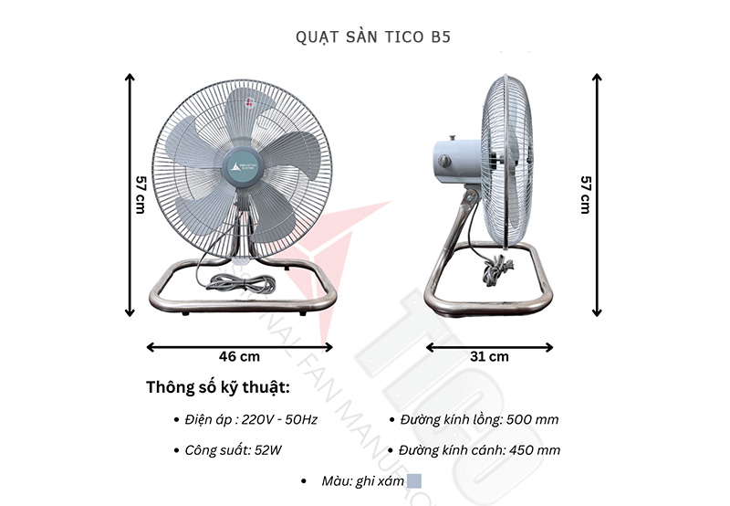 Quạt sàn Tico B5 là dòng quạt công suất trung bình, 1 dạng của quạt bàn chân quỳ, sử dụng quạt ở phần thấp dưới sàn nhà, dùng cho người ngồi, lương gió vừa phải, thân lồng cánh bằng nhựa, cánh nhựa trong kiểu tai voi, công suất 52W. Quạt có 3 tốc độ gió, dễ dàng điều khiển núm xoay trên bầu quạt