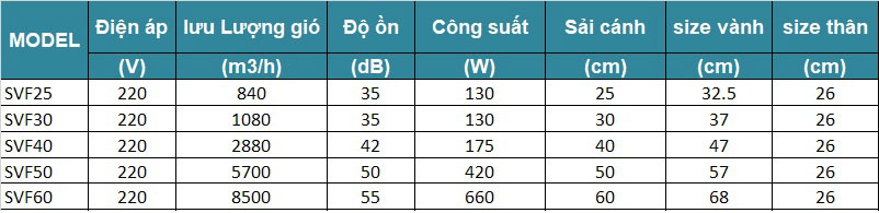 Thông số kỹ thuật các sản phẩm Quạt thông gió công nghiệp tròn Gale