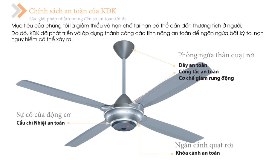 - Tiêu chuẩn Châu Âu: Tất cả các sản phẩm quạt trần KDK đều tuân thủ theo tiêu chuẩn an toàn tuyệt đối RoHS của Châu Âu với 4 tính năng an toàn tuyệt đối là:
