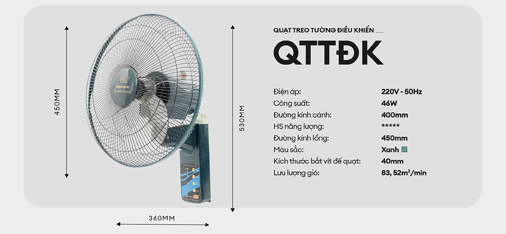 | Tên sản phẩm | Quạt treo tường điện cơ 91 QTT-ĐK |