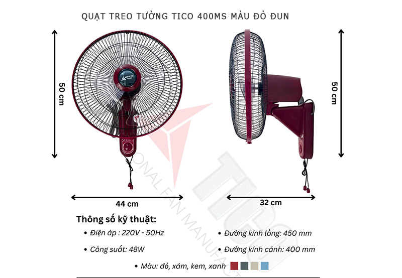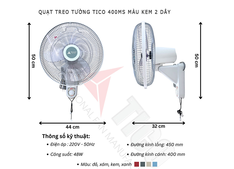 Quạt treo tường Tico 400 MS 2 dây kéo màu kem, (Có tất cả 4 màu Xám, đỏ đun, kem, xanh)