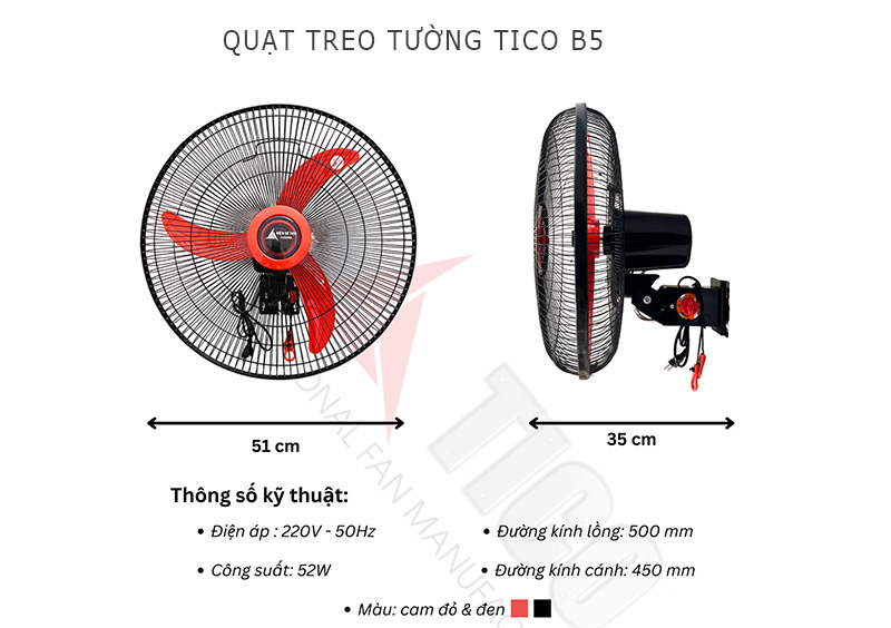 Quạt treo tường công nghiệp Tico B500 sải cánh 450mm, điều khiển cơ, 2 dây giật công suất 52w, sản xuất tại Việt Nam.