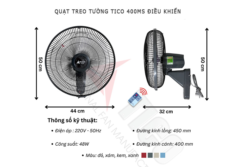 Quạt treo tường Tico MS400 điều khiển từ xa nhiều mẫu mã, màu sắc, sư dụng vòng bi, động cơ dây đồng